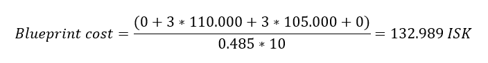 Now, this is the most important part of this invention guide. Inventing T2 BPC’s is pointless if it is not profitable. But how you calculate profitability is somewhat complex. The way I do it is to first calculate the invention cost for a single run of a T2 BPC you want to invent. To do so I use the following formula.