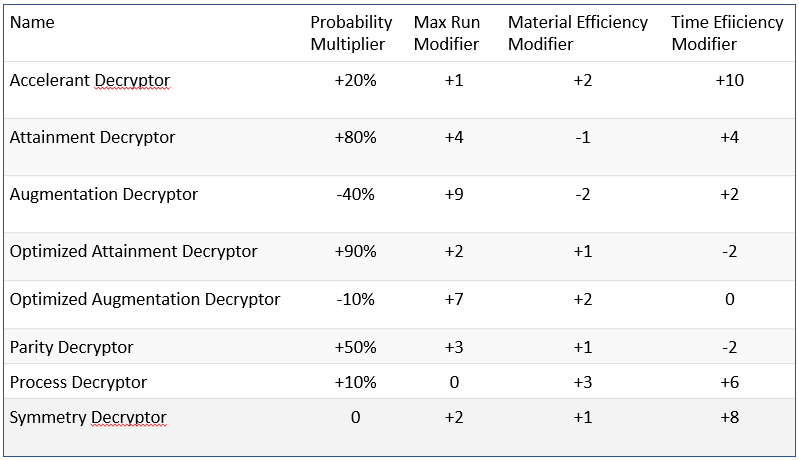 Decryptors are specialized items that modify the output of successful invention jobs. To use a decryptor is optional, but I recommend that you do so only if you are inventing ship T2 BPC’s and a few high-value T2 module BPC. Which decryptor is best to use is however something you need to decide for yourself as it varies wildly between items and in time wehter the use of a decryptor is profitable. The decryptors and what they do is listed below.