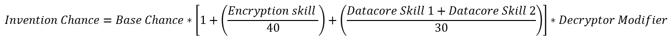 But from this formula, you can see that your encryption and datacore specific skills are extremely important for a successful invention career. Personally, I would not recommend starting inventing T2 BPC’s at all until all the relevant skills for a specific BPC are at level 3, even level 4. For ships, I would aim for level 4 to level 5.